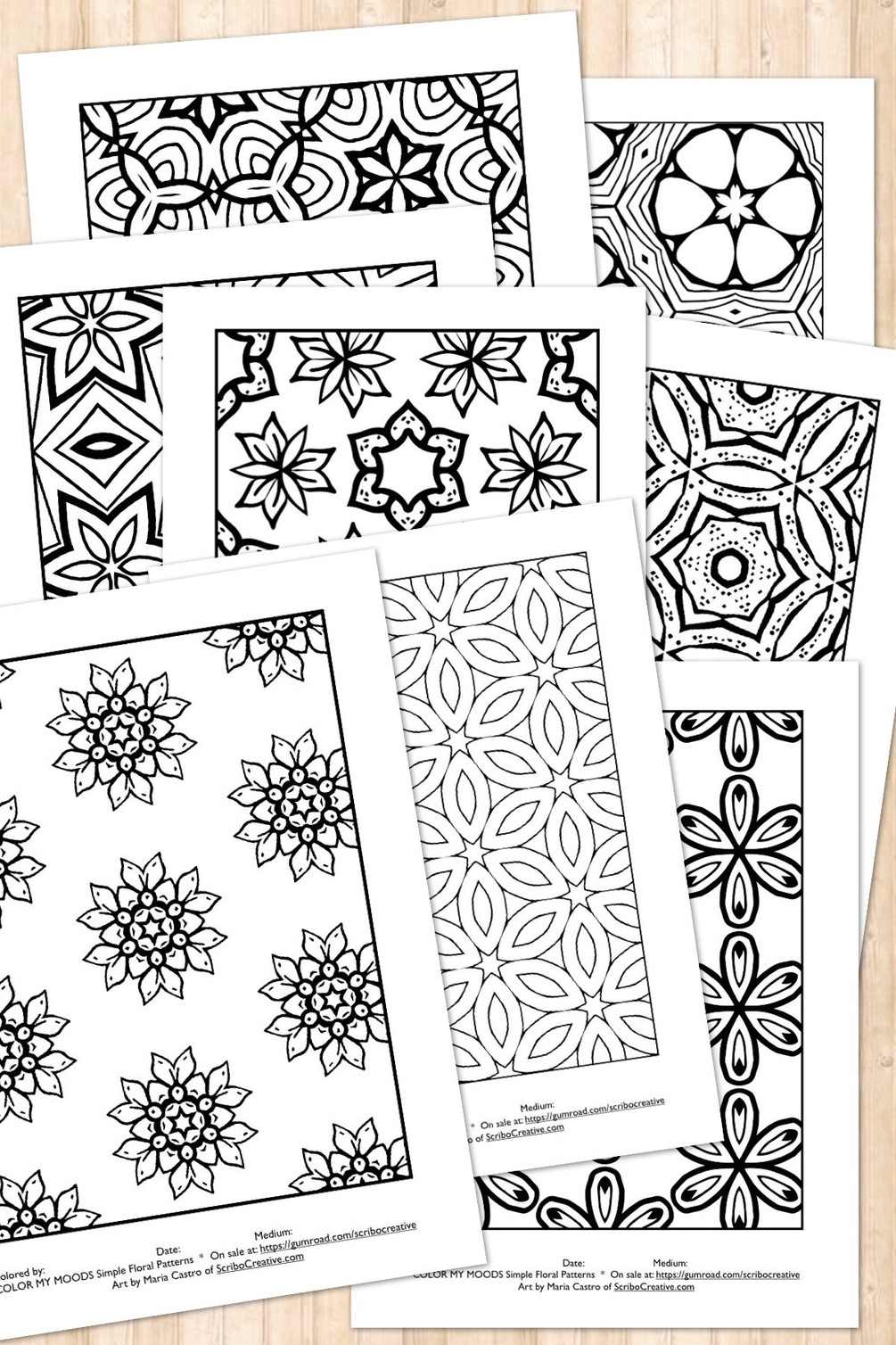 Enjoy the relaxing effect of coloring these simple yet beautiful floral patterns by Maria Castro of ScriboCreative.com. 8 designs included. Print as many copies as you wish (for personal use only).
